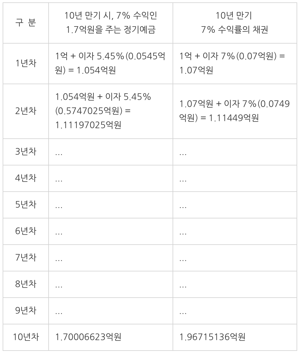 질문) 10년 만기 시, 7% 수익률을 제시한 정기예금 VS. 10년 만기 7% 수익률의 채권 중 만기인 10년 후, 받게 되는 원리금은 어느 쪽이 많을까?(원금은 1억원으로 가정한다.)